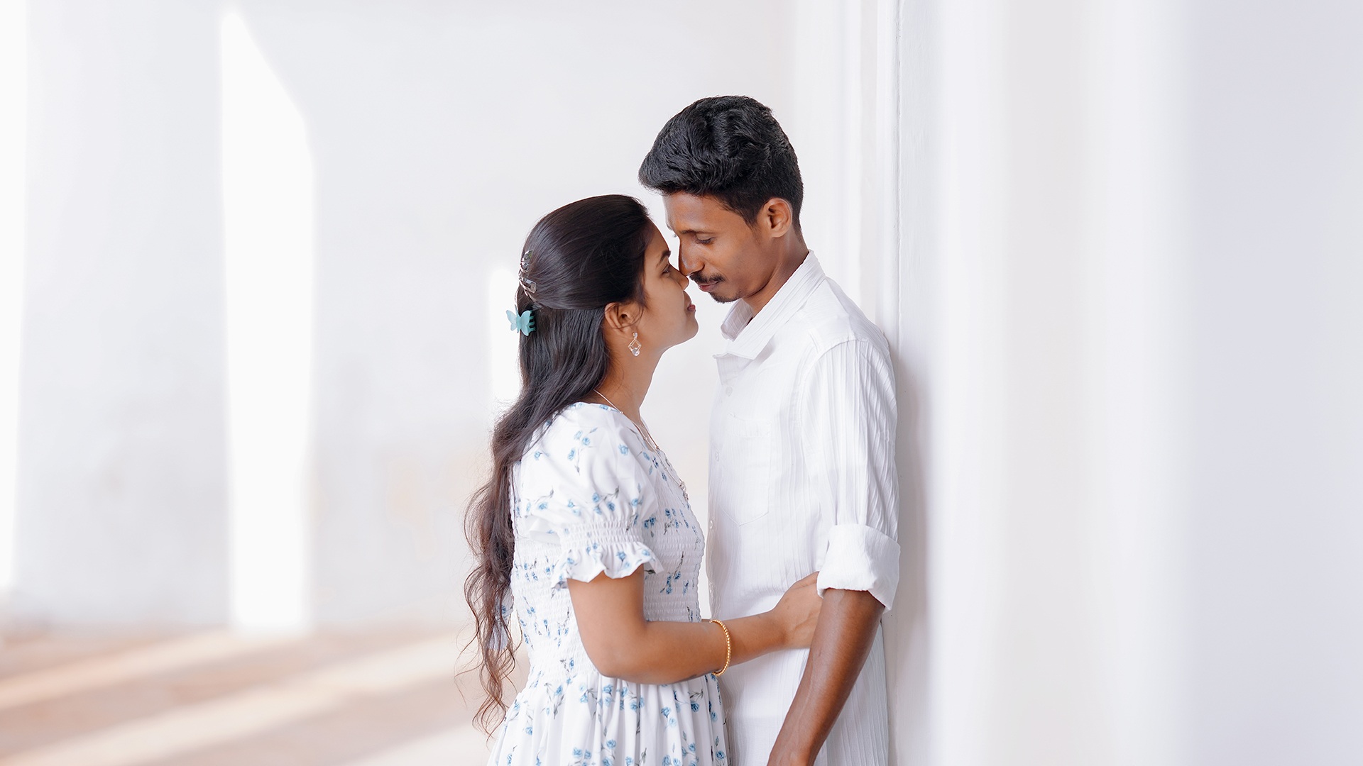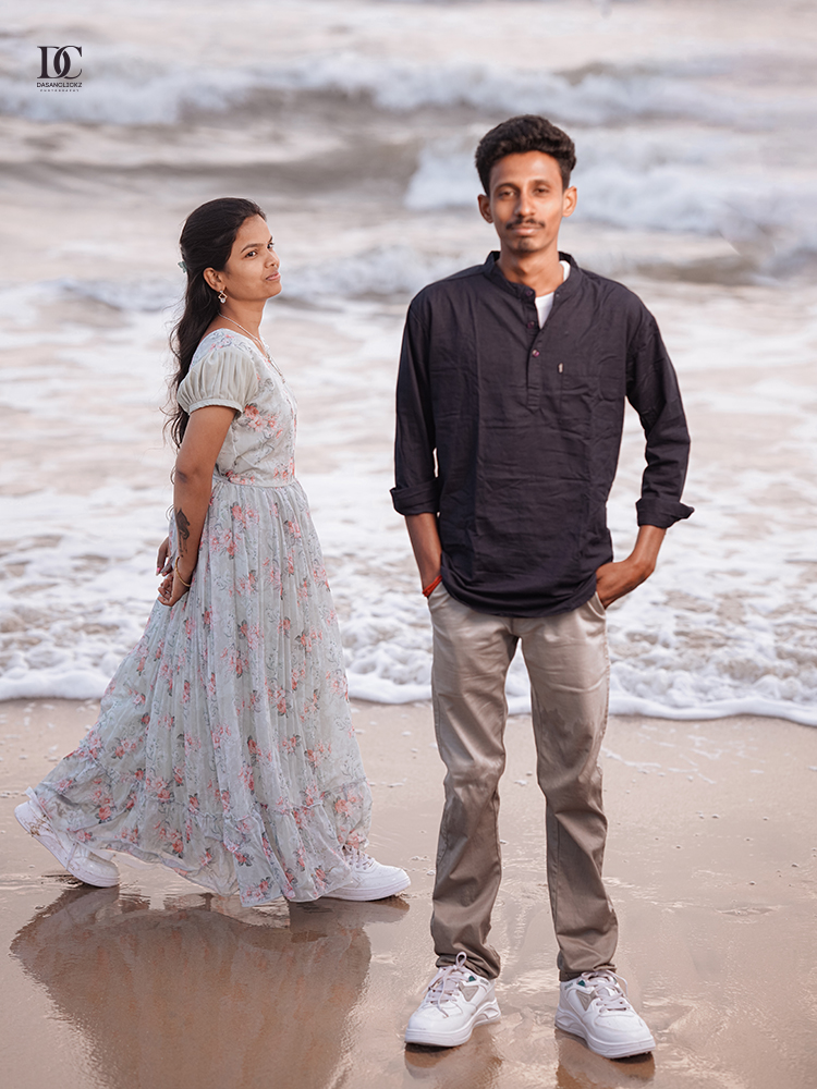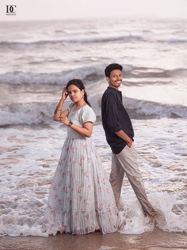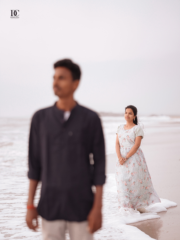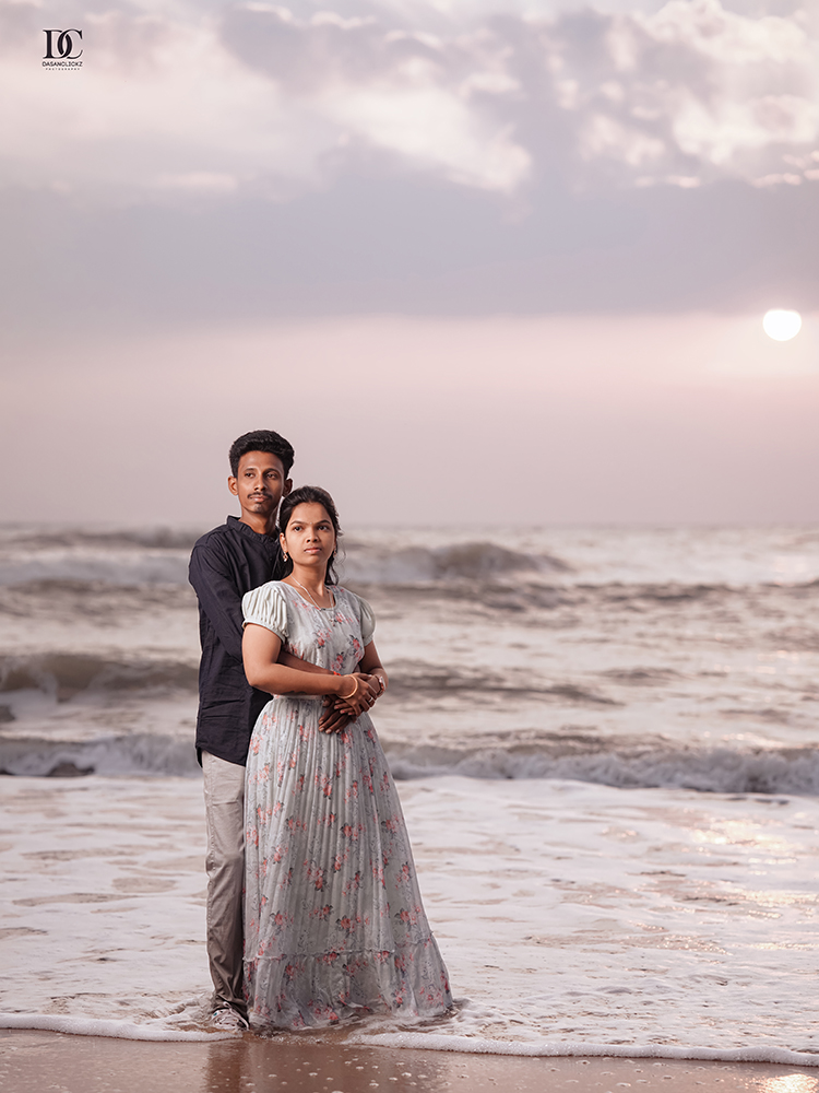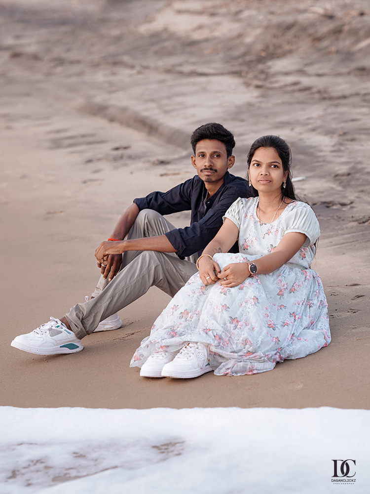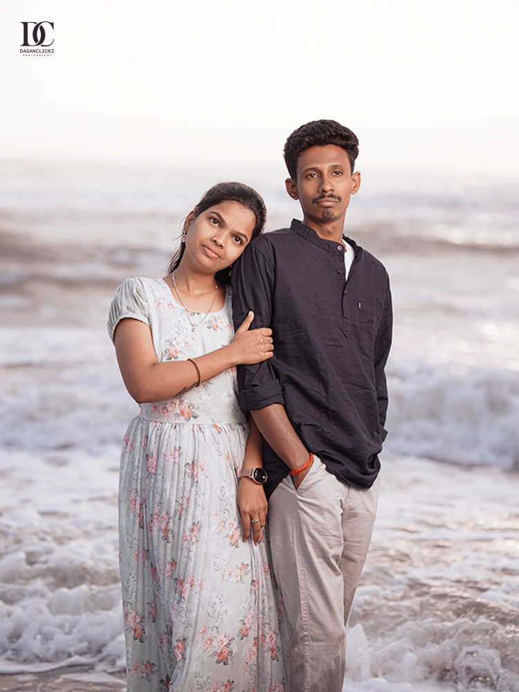 A beautiful pre-wedding story of Mano & Gayu, captured along the serene beach shores of Tharangambadi Beach, Mayiladuthurai. As a professional photographer based in Thiruchitrambalam, we focused on their genuine emotions, soft candid moments, and romantic sunrise portraits.